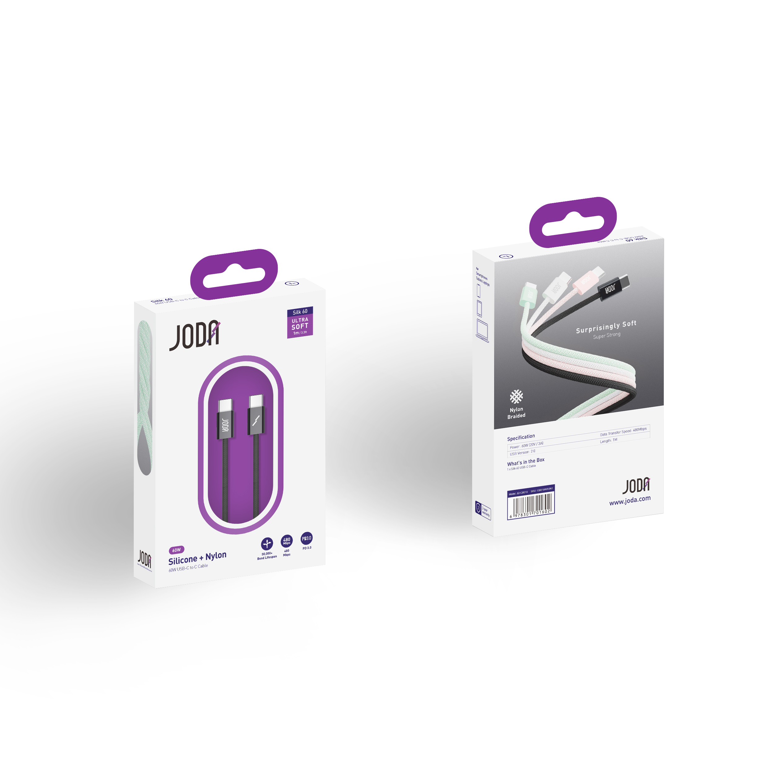 اكتشف الفخامة في الشحن اليومي مع كابل JODA Silk 60 USB-C إلى USB-C المصنوع من نايلون فاخر ناعم الملمس يجمع بين الأداء العالي والتصميم الأنيق.